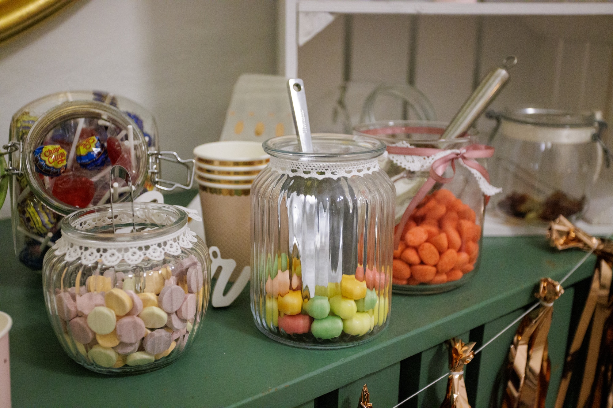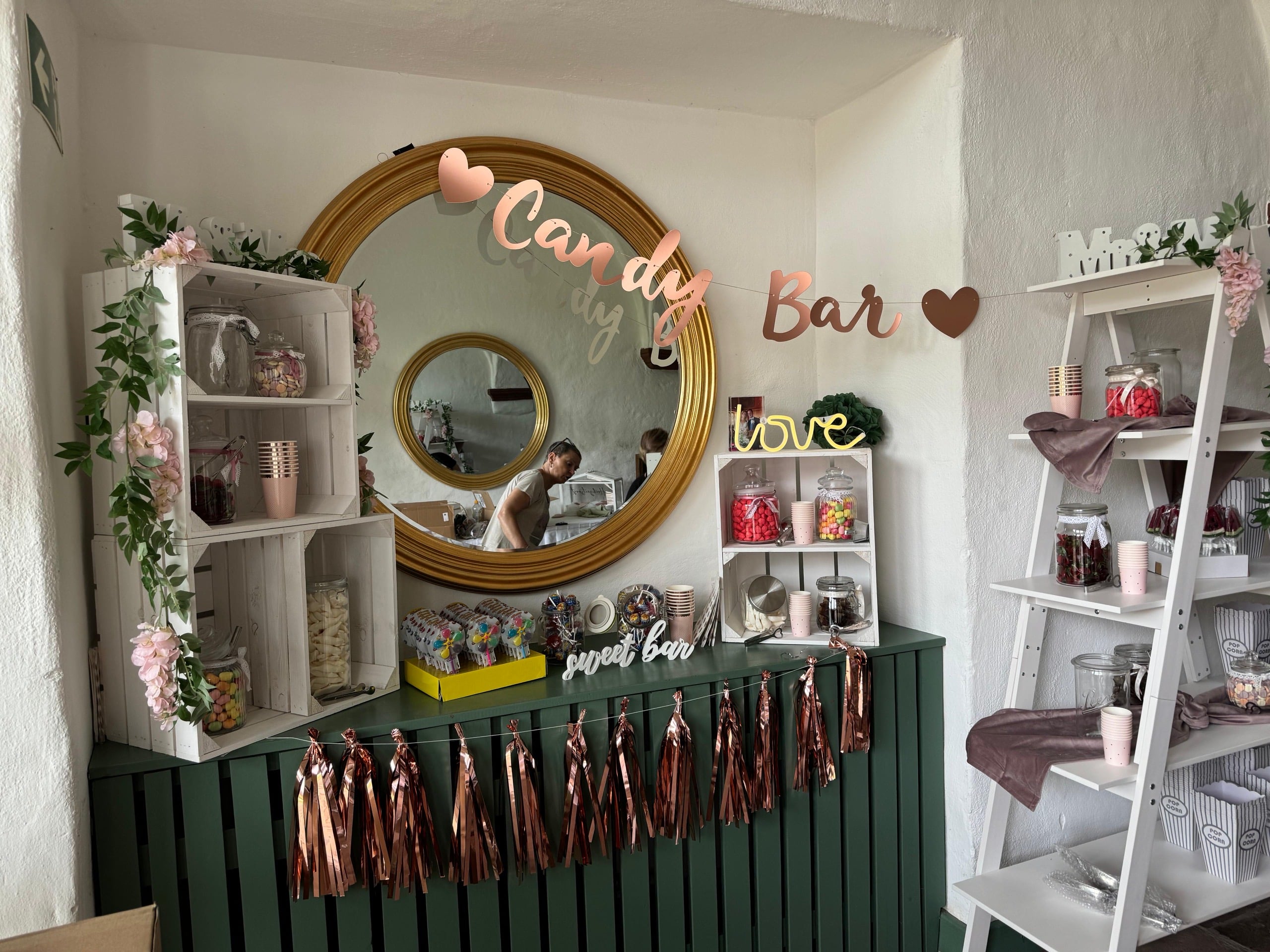 Ein echter Hingucker habt ihr mit unserer Candybar aus weißem Holz. Stilvoll, zeitlos und in jede Location mit individueller Dokoration von euch selbst zu integrieren. Inbegriffen ist das weiße dreistöckige Regal und drei weiße Holzkisten (im Bild links zu sehen). Auf Anfrage stellen wir auch noch passende Behältnisse aus Glas und kleine Zangen / Schaufeln (siehe weitere Artikel in Leckereien).