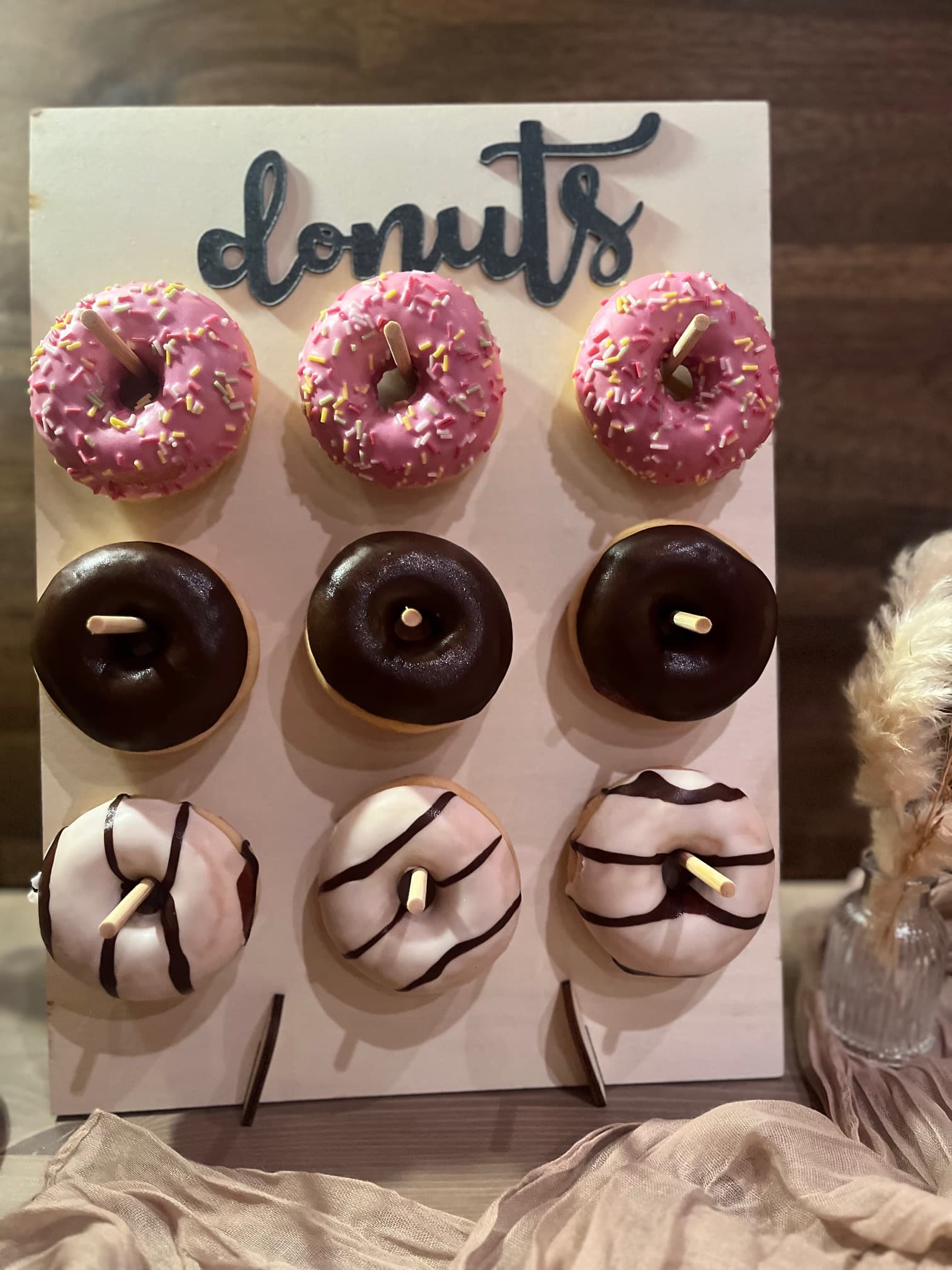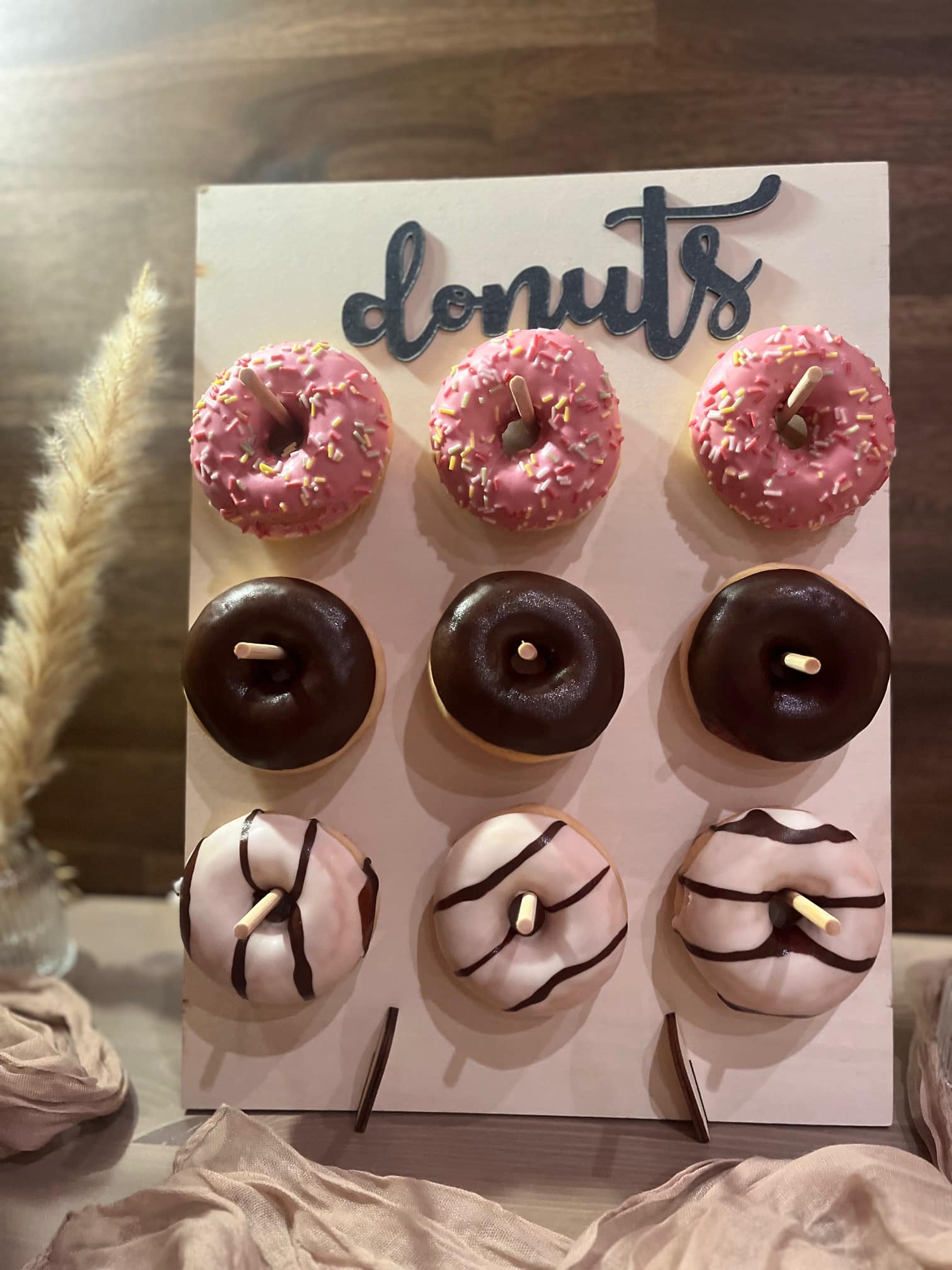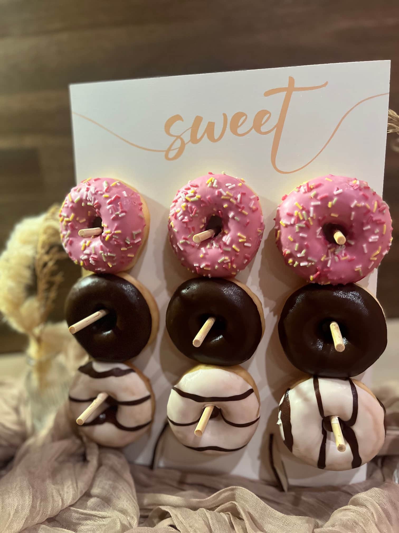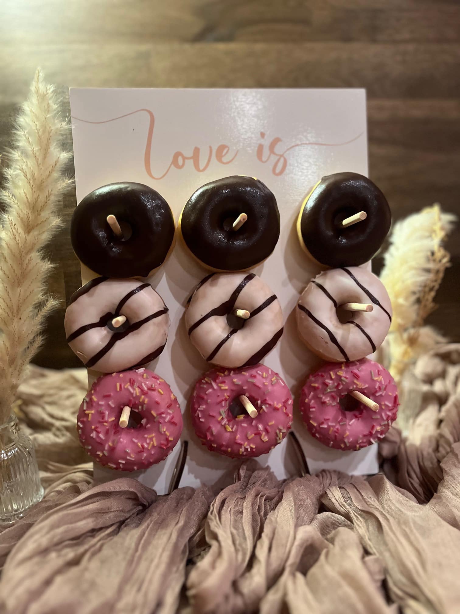 Die Donutwand Love is sweet darf auf keiner Feier fehlen. Sie ist aus weißem und hellem Holz und in jede Location  mit individueller Dokoration perfekt  zu integrieren.