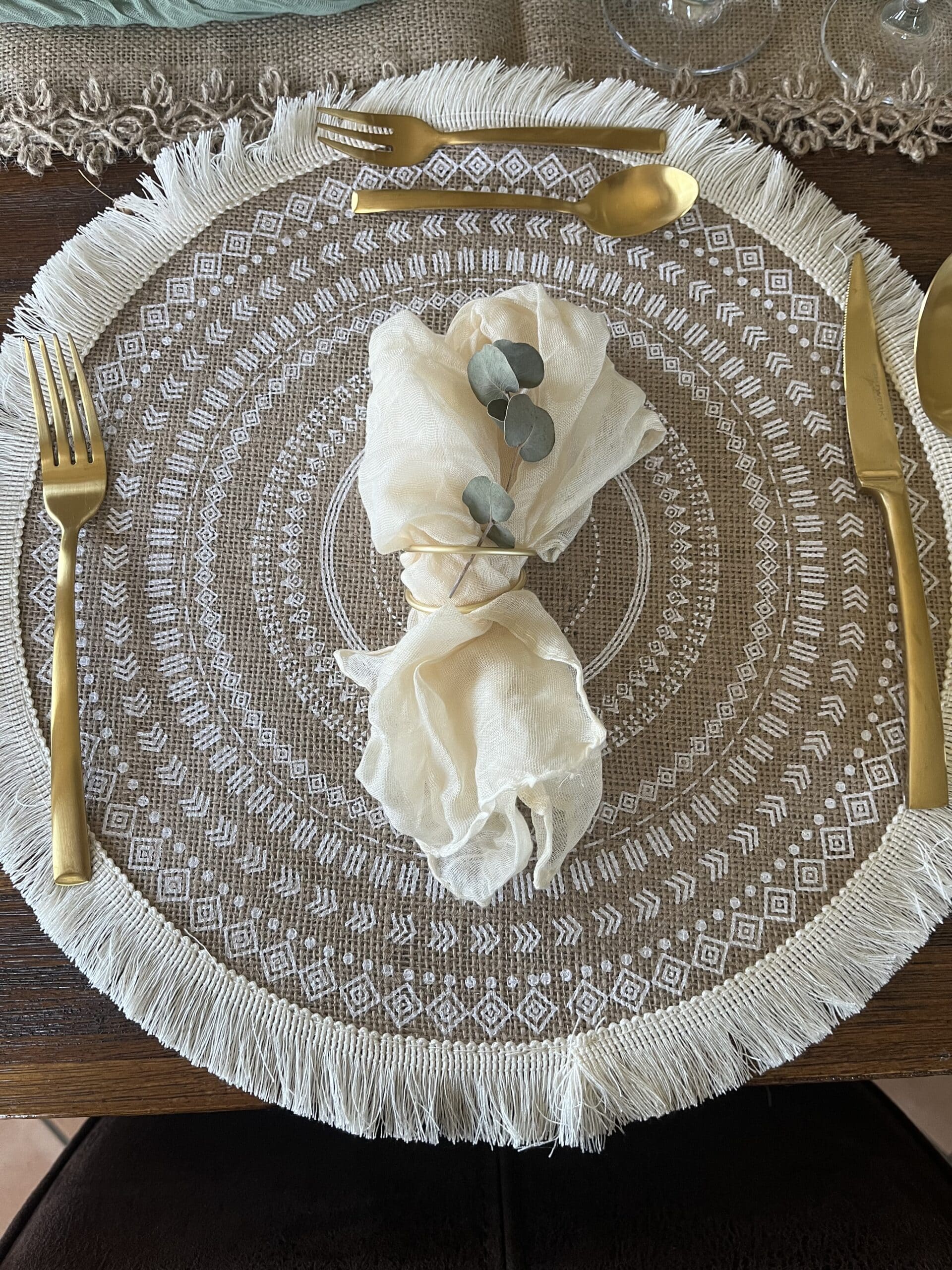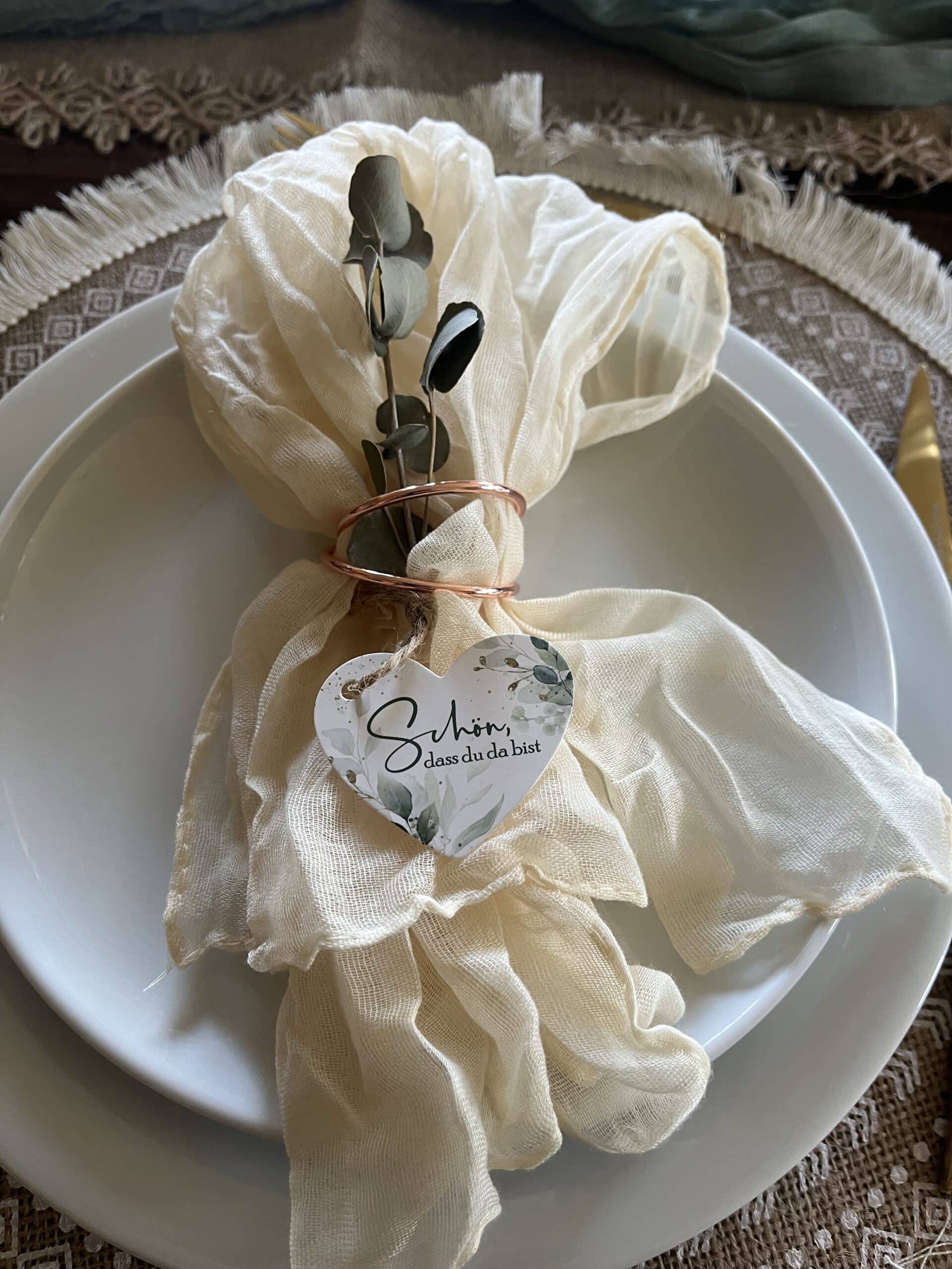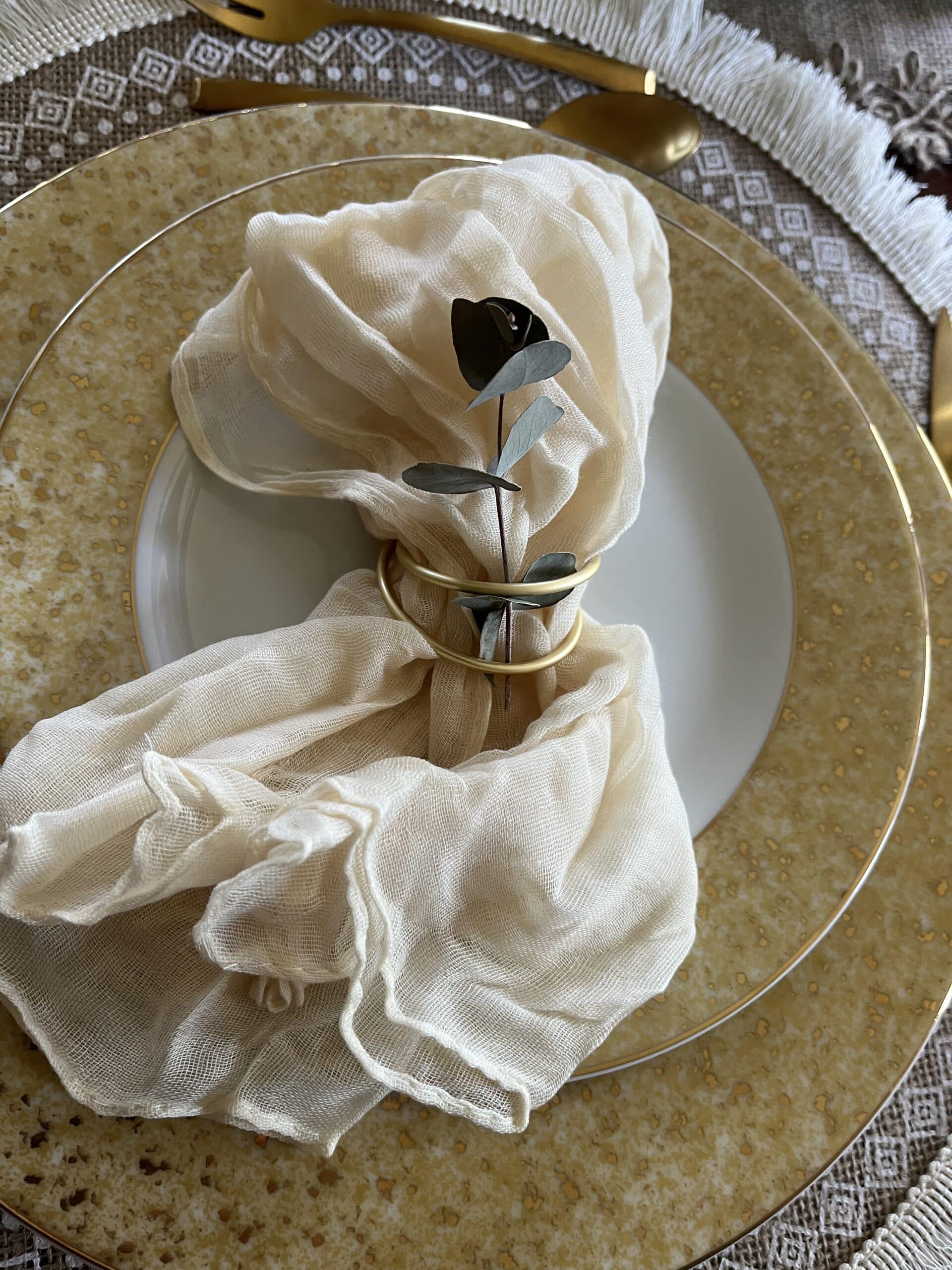 Mit unsere traumhaft schönen beigefarbenen Boho-Gaze Servietten zaubert Ihr eurer Tischdekoration in eine natürliche und verspielte Atmosphäre. Passend zum Stil eurer Hochzeit. Durch verschiedene Farben unseres Servietten-Sortiments, könnt ihr die passende für eure Blumendekorationen aussuchen. Viel Spaß bei der Auswahl eurer Lieblingsservietten.