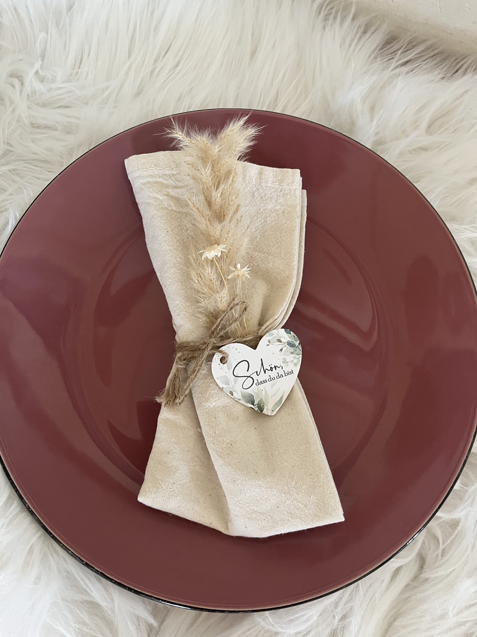Mit unseren Servietten aus naturbaumwolle zaubert Ihr eurer Tischdekoration in eine natürliche und gemütliche Atmosphäre. Passend zu eurer Boho-, oder Vintage-Hochzeit. Durch verschiedene Farben unseres Servietten-Sortiments, könnt ihr die passende für eure Blumendekorationen aussuchen. Viel Spaß bei der Auswahl eurer Lieblingsserviette.