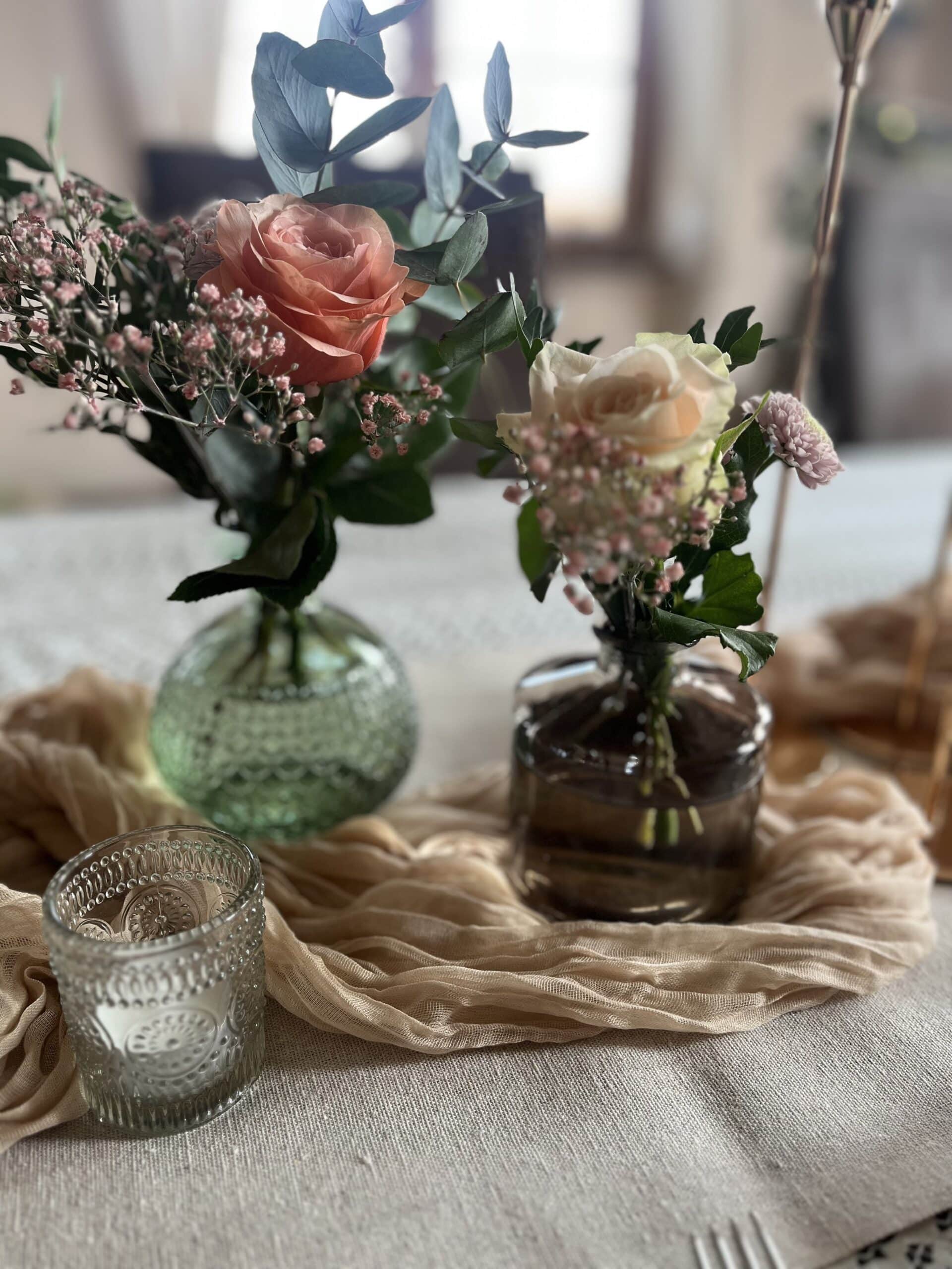Unsere schönen Vasen aus braun eingefärbtem Glas in zwei verschiedenen Designs passen zu jeglicher Farbkombination und setzten eure Blumendekoration perfekt in Szene.